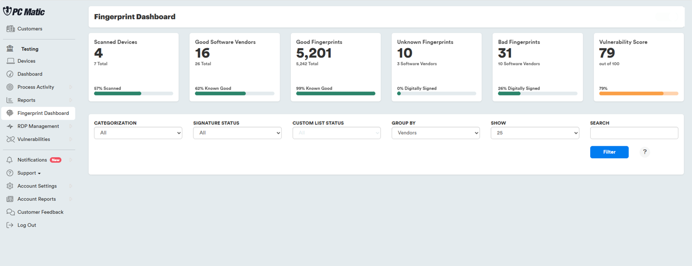 - Displays the number of software vendors across all scanned Windows devices as well as the percentage of vendors with files that are categorized as Known Good by PC Matic. Click the large number to view Known Good files grouped by vendor. Click the Total number to view all files grouped by vendor.