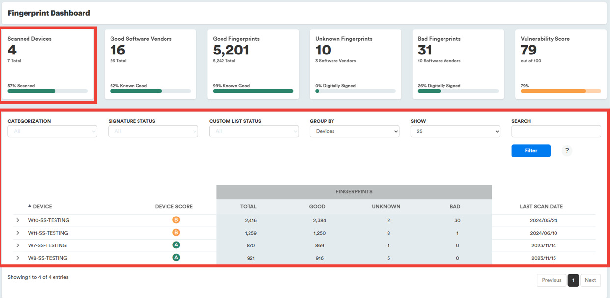 Once your scheduled Fingerprint Scan has run, the number of devices scanned will be updated, as well as populate the the other cards.