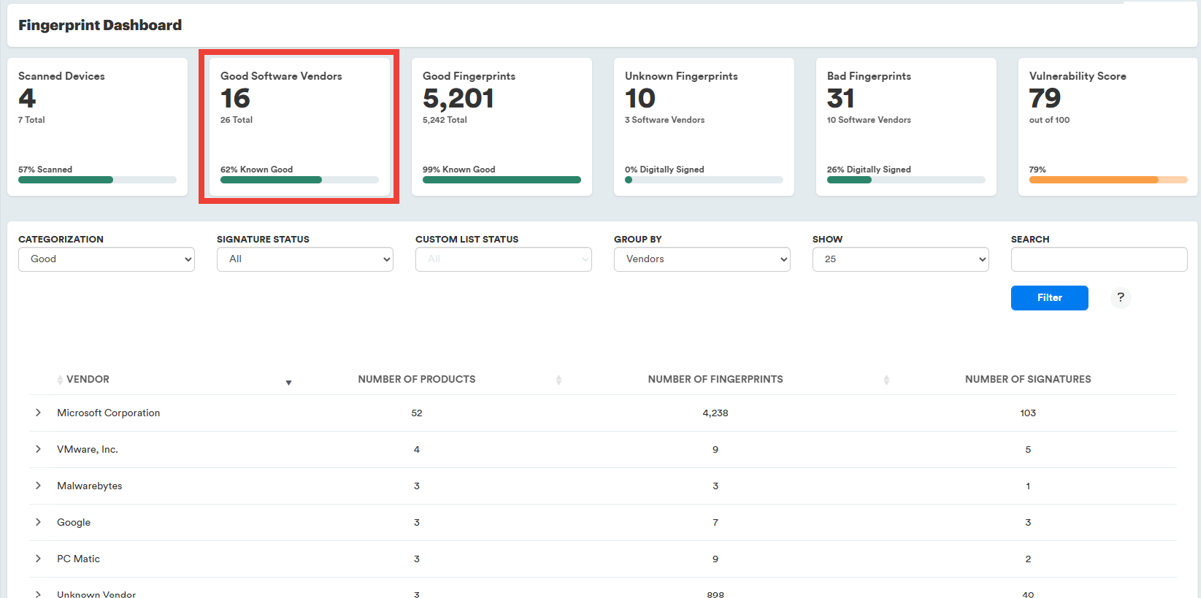 In the window below the cards, the files will be listed by software vendor name. The columns display the vendor name, number of products, number of files, and the number of signatures used to sign the files.