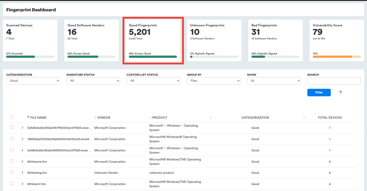 Displays the number of files that are categorized as Bad by PC Matic, the number of software vendors the files belong to, and the percentage of files that are digitally signed. Click the large number to view the list of files. Click “Software Vendors” to view files grouped by vendor. Click “Digitally Signed” to view the files filtered to those that are digitally signed.
