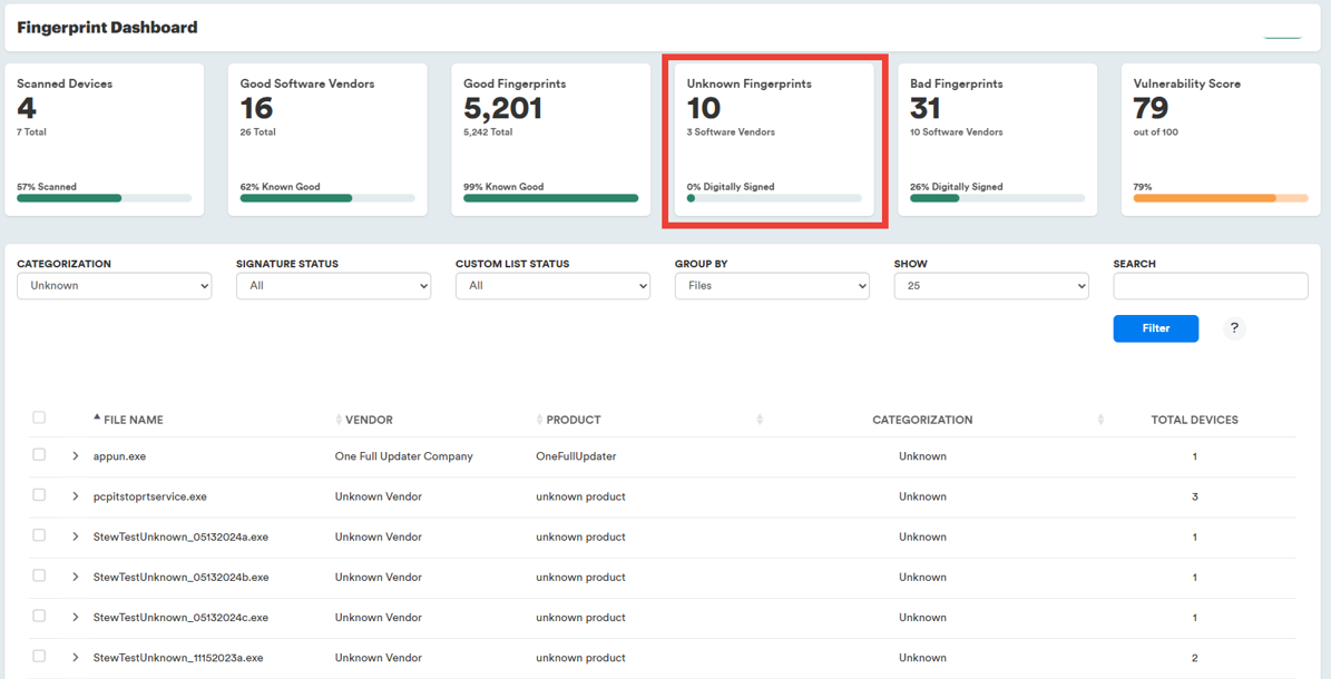 The Fingerprint Dashboard provides details about the software installed across Windows devices across a company and allows for easy management of the software allowed to execute on these devices. To access the Fingerprint Dashboard select Fingerprint Dashboard in the sidebar.