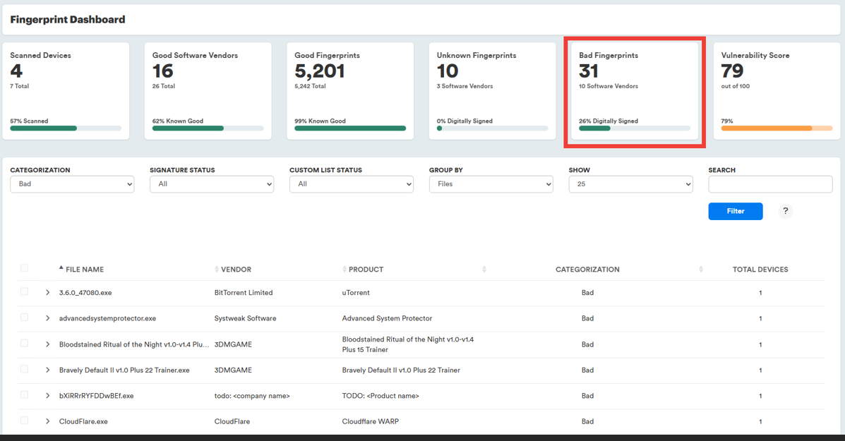 - Displays the number of files that are categorized as Bad by PC Matic, the number of software vendors the files belong to, and the percentage of files that are digitally signed. Click the large number to view the list of files. Click “Software Vendors” to view files grouped by vendor. Click “Digitally Signed” to view the files filtered to those that are digitally signed.