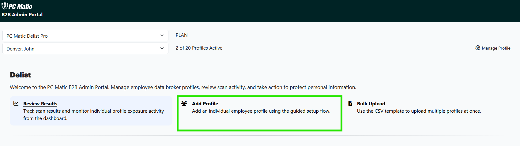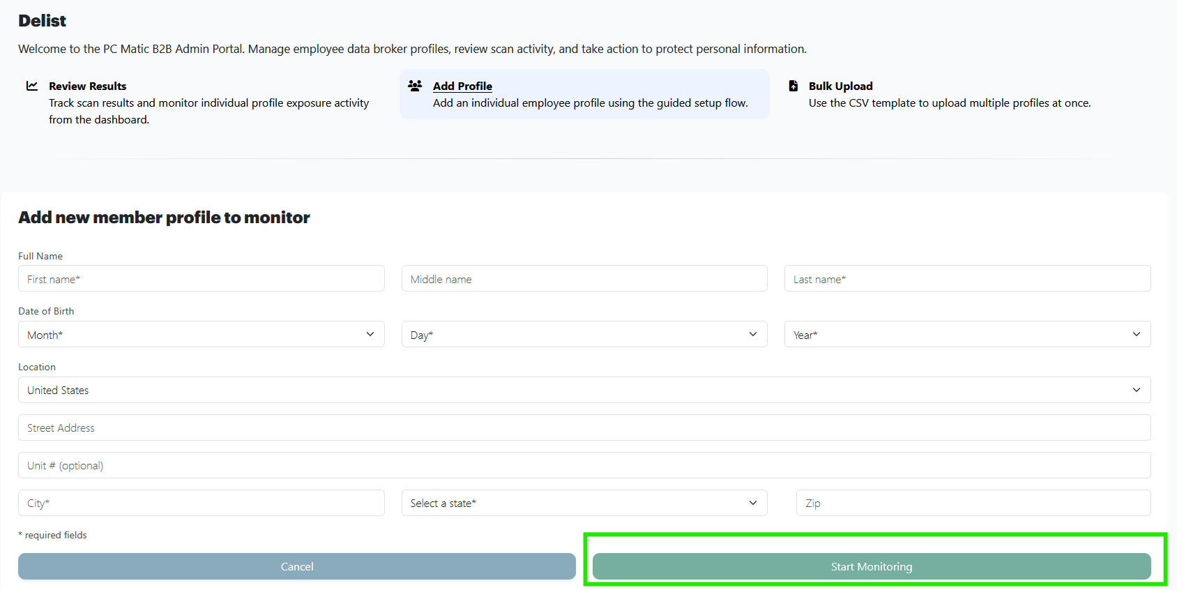 How do I add a new employee? Log in to your Delist Admin Portal at delist.pcmatic.com Click on Add Profile Enter the employee's information. Click the Start Monitoring button.